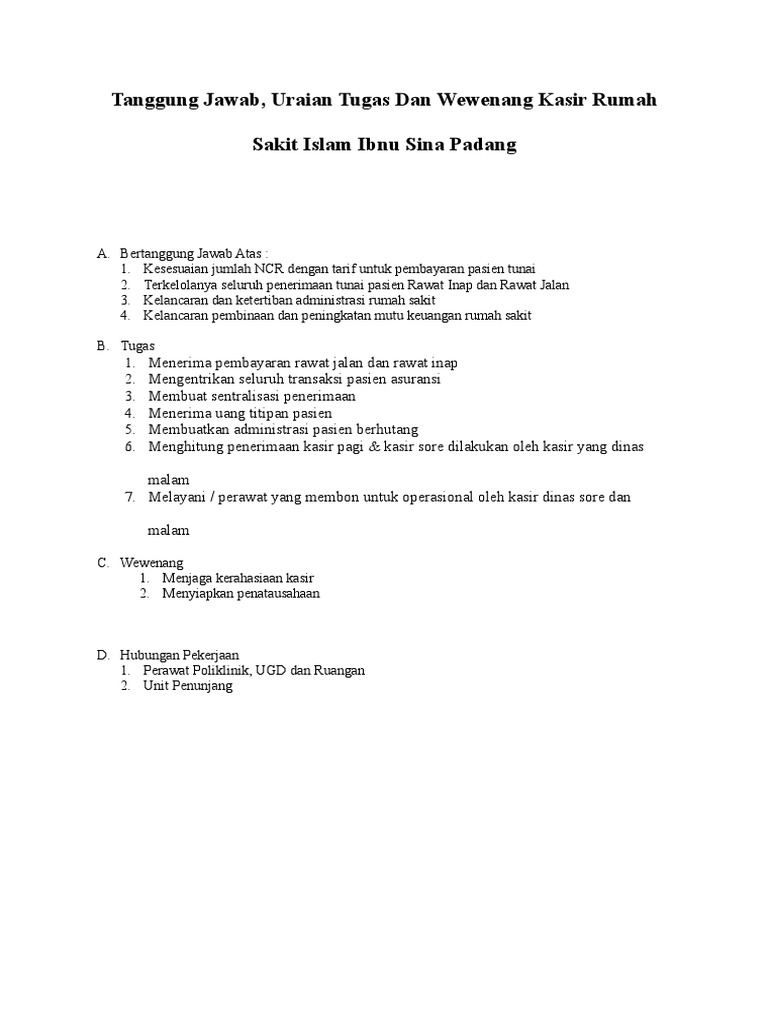 Uraian Tugas Kasir Rawat Inap. Pastikan mesin kasir berfungsi dengan baik. Selain dengan atasan langsung Kedalam Intern Antar Dept.